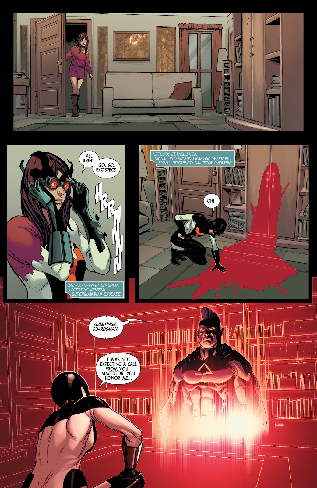 -Un día antes en la ciudad de New York la familia Guthrie y su invitado Da Costa juegan con Josiah, el bebé de la pareja, quien puede caminar por el techo mediante sus poderes. Izzy Kane/Smasher recibe una llamada del imperio Shi'ar así que va a hablar en privado. Kane se coloca sus exolentes manifestando su traje y emite un proyección del Majestor Kallark para establecer la comunicación. Kane pregunta la razón de la llamada y Kallark explica que antes de ser el Majestor fue el pretor de la Guardia Imperial ganando su fama digna de leyenda como guerrero que luchó en múltiples batallas lo que hace que valore a los guerreros a su servicio pero Kane no entiende por qué dice eso a lo que Kallark le ordena que regrese a servir al imperio con su familia informando que se encuentra en su nave insignia Lilandra. Kane argumenta que está demasiado lejos necesitando tiempo pero Kallark afirma que el tiempo se acaba además de mencionar que su nave se encuentra más cerca de su ubicación de lo que cree.