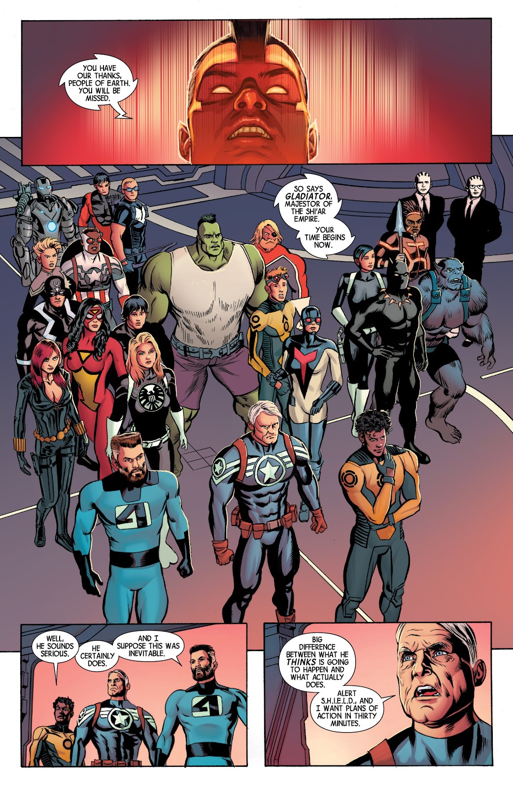 -Kallark se levanta del trono donde está sentado y dice que su deber como el Majestor ante todo es asegurar la supervivencia del Imperio Shi'ar aún si eso le produce un gran sufrimiento personal entonces una gran cantidad de naves arriba hacia la posición de los Shi'ar mientras Kallark afirma que para este punto está más allá de su voluntad el impedir la destrucción de la Tierra. Se muestra como llegan las naves de los imperios Kree y Skrull, drones de la Ola de Aniquilación y naves vivientes Acanti de The Brood listas para la guerra.