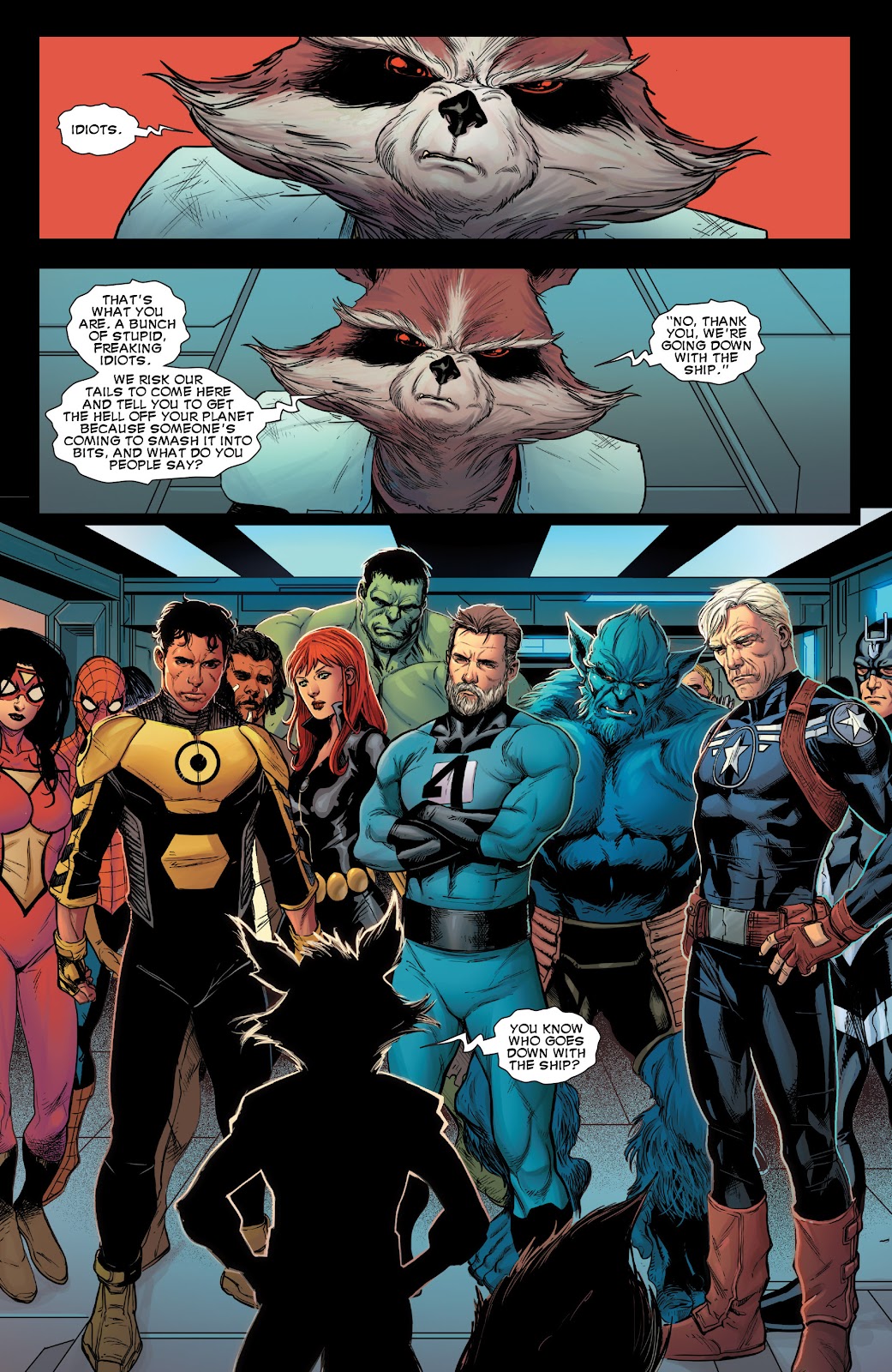 -Sin embargo Rocket es convencido por el resto del grupo y la nave espacial que tripulan se adelanta a la armada de The Galactic Council para avisarle a la Tierra del ataque pero Rocket no puede creer que después de que arriesgaran sus vidas para advertirles los héroes de la Tierra (The Avengers y The Illuminati) en vez de planificar una huida se queden a luchan aún cuando sea imposible ganar entonces se produce el arribo de la armada espacial a la órbita terrestre.