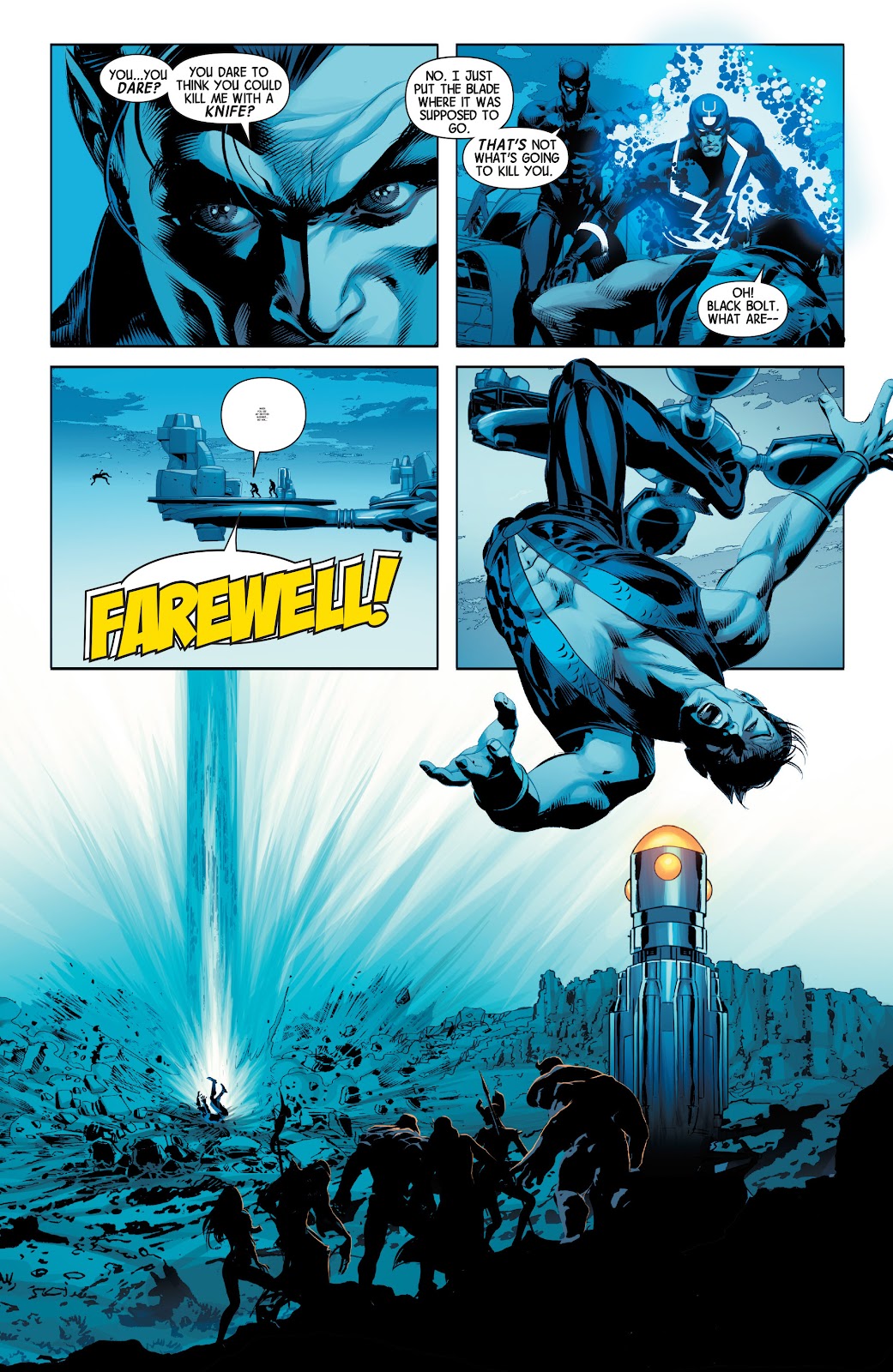 -Mientras el contenedor avanza abriéndose para liberar su contenido con los Beyonders un furioso Doom los maldice por haber usado a la vida como sus juguetes desechables además maldecir el costo de su accionar afirmando que los devolverá "el golpe" matándolos pero parece que algo imprevisto ocurre haciendo que la carga explote sobre los Beyonders y también Doom, Reece y Strange parecen recibir de lleno la explosión siendo el destino de todos ellos desconocido. En el Universo-616, un tiempo antes de la batalla en Cádiz entre The Illuminati y The Avengers, durante una revisión de El Puente unos horrorizados Reed Richards y T'Challa descubren que de los cientos de miles de universos que quedaban ahora solo quedan 22 universos afirmando que se les acabo el tiempo. Ellos no saben que ese fue el resultado del plan final de Doom.