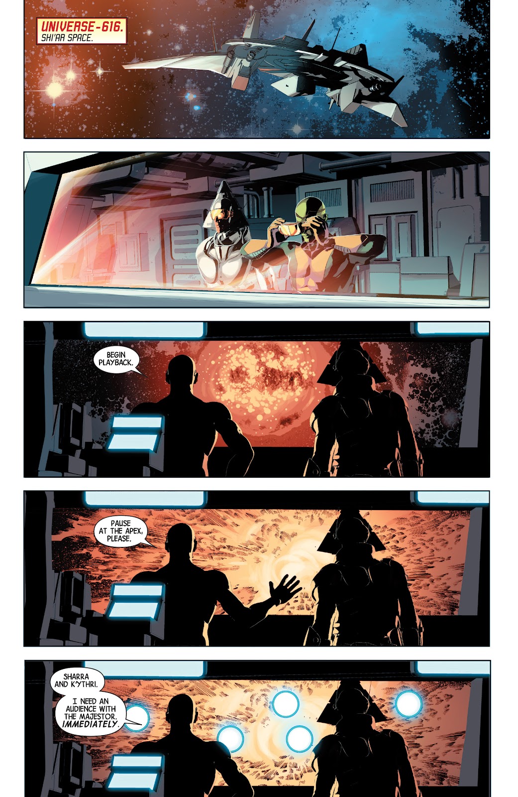 -En la galaxia Shi'ar del universo 616 una nave del Imperio Shi'ar, con el miembro de la Guardia Imperial llamado Mentor abordo, estudia la autodestrucción temprana de una estrella descubriendo la causa tal catástrofe y entonces parte para informar al Majestor Kallark/Gladiator. En el mundo trono Shi'ar el Majestor Kallark tiene una audiencia con Mentor donde el primero pregunta si esta seguro de su descubrimiento y Mentor lo afirma explicando que todo comenzó un año atrás pero la guerra contra los Builders los mantuvo ocupado por lo que cuando las estrellas empezaron a morir se llegó a pensar que eran fenómenos aleatorios sin embargo al continuar toda la comunidad científica del Imperio llegó a creer que era causado por algún ser u organización con malévolas intenciones y en eso se equivocaron ya que era mucho peor que eso. Mentor admite que falló siendo demasiado tarde para remediarlo siendo inevitable el fin del Imperio Shi'ar pero Kallark le ordena preparar un informe con sus hallazgos para mostrarle a The Galactic Council y afirma que todavía no están acabados ya que los Shi'ar luchan hasta el final.