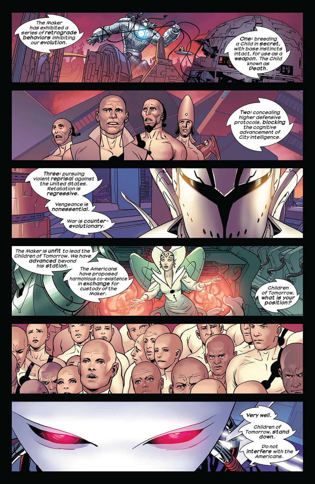 -Stark contraataca disparando energía del reactor de su pecho incinerado parte del casco de Rogers. Otro flashback muestra como Stark explica cómo el mundo sufre un aumento dramático de amenazas mundiales además de tener una gran cantidad de enemigos pero la idea más simple eran la solución al problema siendo Rogers quién tuvo esa idea entonces de vuelta en el presente mientras se quita el casco de su armadura Rogers dice que la idea de agrandar a The Avengers junto a la construcción de la Avengers Machine fue un engaño para mantener distraída y vigilada a la comunidad superhumana haciendo que ignoren la amenaza que representaban las Incursiones ya que él sabía que nunca podrían detenerlas. Stark admite que siempre supo de esa posibilidad explicando que fue la amenaza más temible que hayan enfrentando así que lo necesario para ganar tiempo suficiente para descubrir si era posible detener a las Incursiones pero ninguno de The Illuminati lo notó por sus propios conflictos personales y en el caso de Richards esté siempre creyó que lo lograrían de alguna forma. Rogers toma su escudo y le exige a Stark que admita en su cara que le mintió.